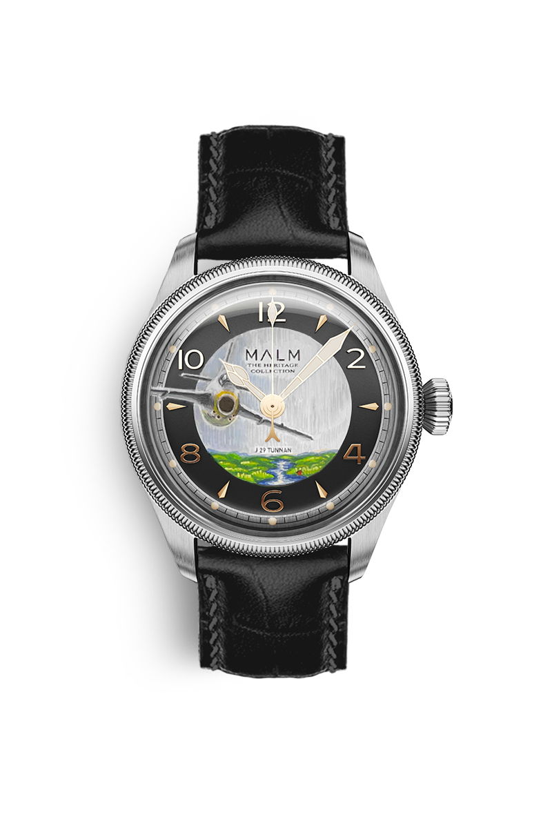 Inspired by the iconic J29 Tunnan, this pilot watch pays tribute to Swedish aviation history and celebrates the 100th anniversary of the Swedish Air Force. Each watch features a hand-painted dial, designed and painted by Mythic Scandinavian Watch Art, depicting the legendary J29 Tunnan aircraft—Each dial is painted to order, making every piece unique.
