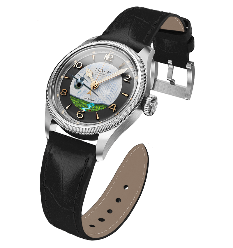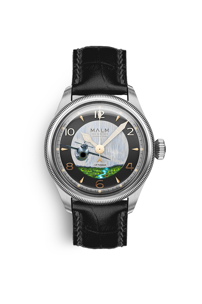 Inspired by the iconic J29 Tunnan, this pilot watch pays tribute to Swedish aviation history and celebrates the 100th anniversary of the Swedish Air Force. Each watch features a hand-painted dial, designed and painted by Mythic Scandinavian Watch Art, depicting the legendary J29 Tunnan aircraft—Each dial is painted to order, making every piece unique.